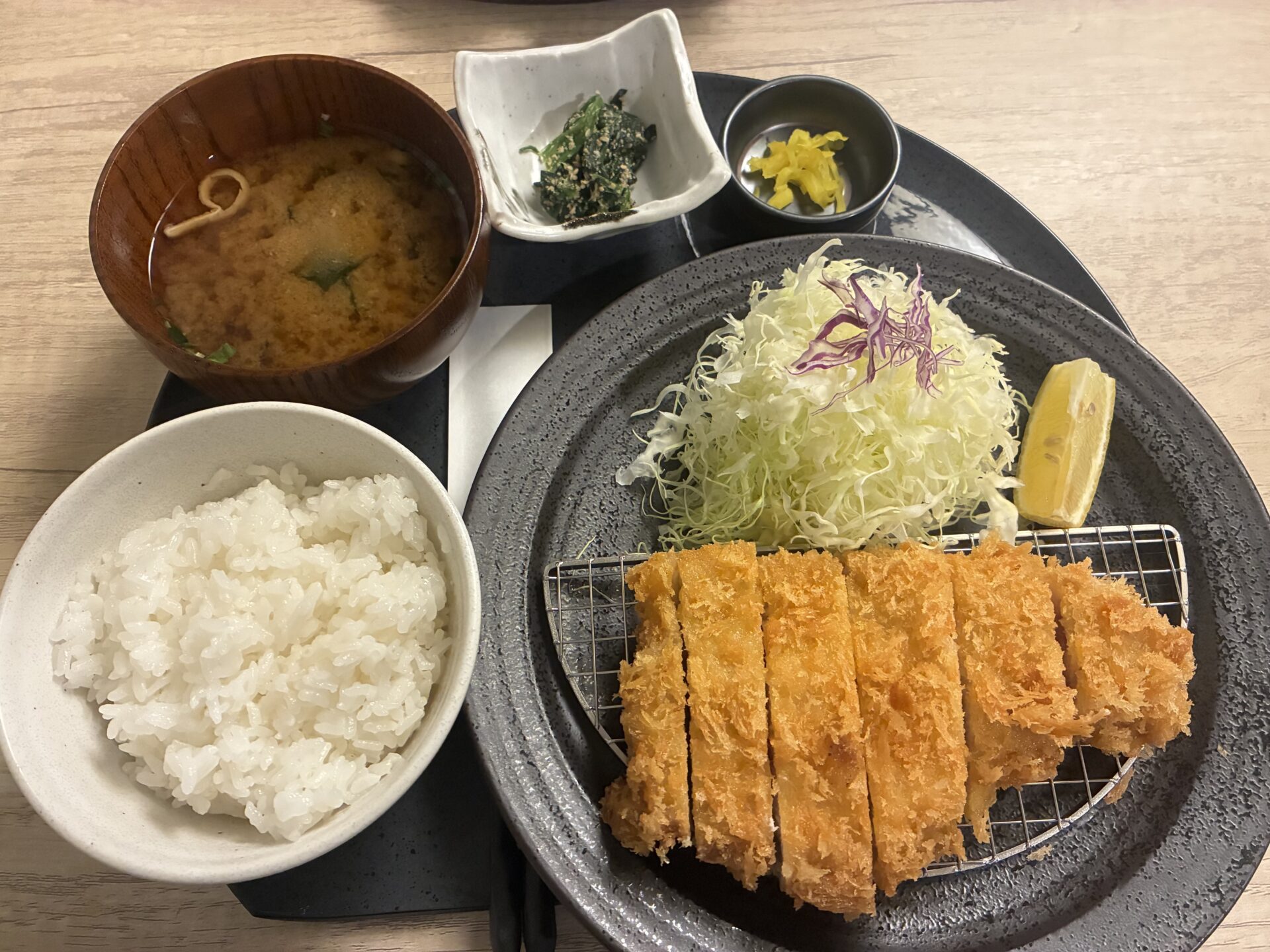 メインのロースかつに、たっぷりのキャベツ、小鉢、赤だし、漬物、ご飯のセットです。待っている間、厨房から聞こえてくる豚カツが揚がるピチピチ音がたまりませんでした♪