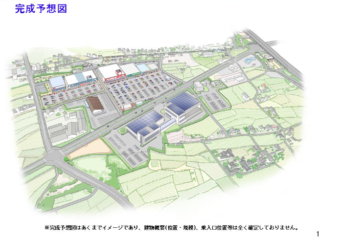 たつの市龍野町大道、四箇付近にショッピングセンターができるみたい。現地には掲示も設置されています(元コストコ予定地)。たつの市の公式HPには周辺まちづくり事業の完成予想図があり、大道側が商業施設、四箇側にも別の建物が計画されているようです。