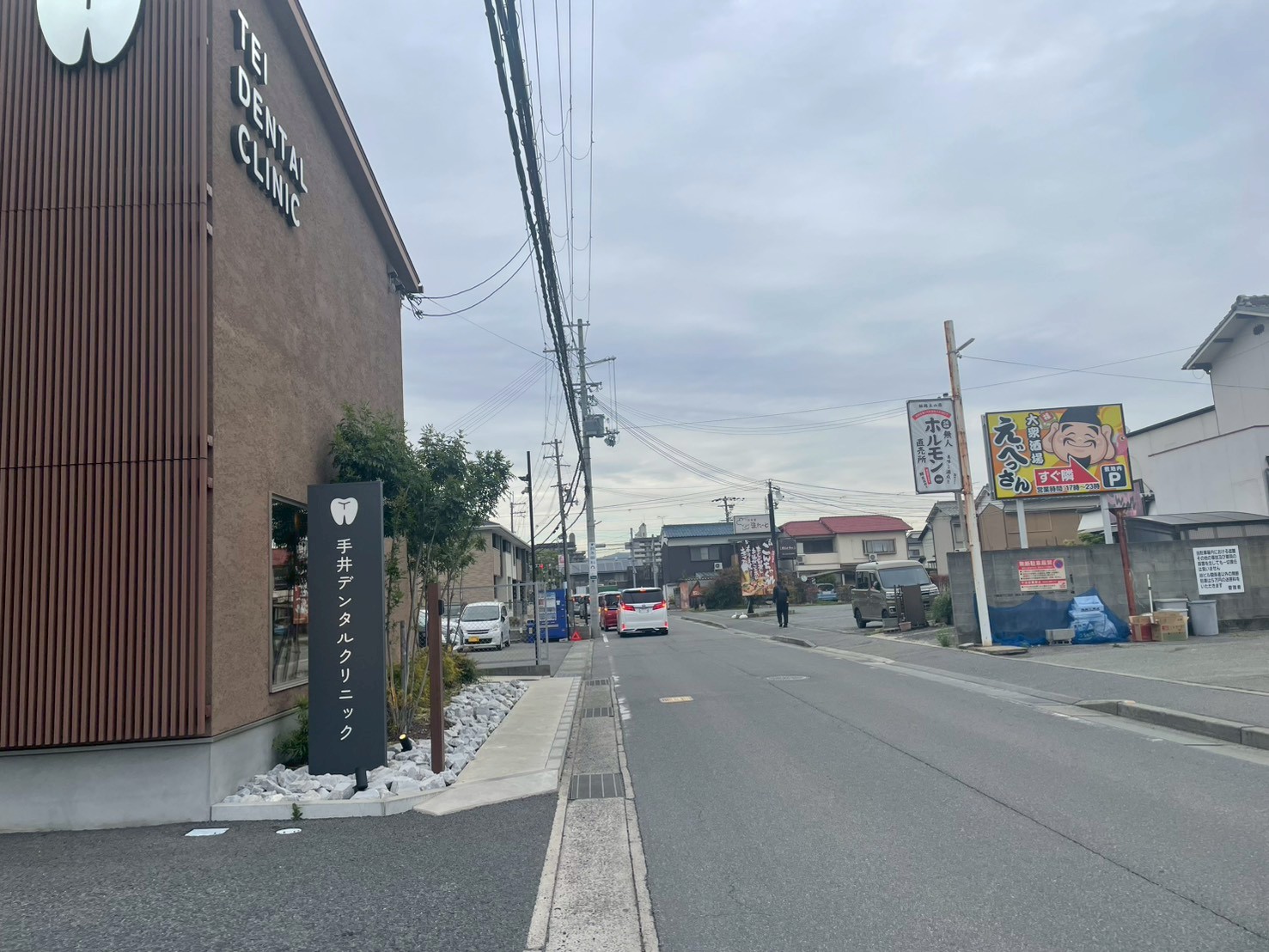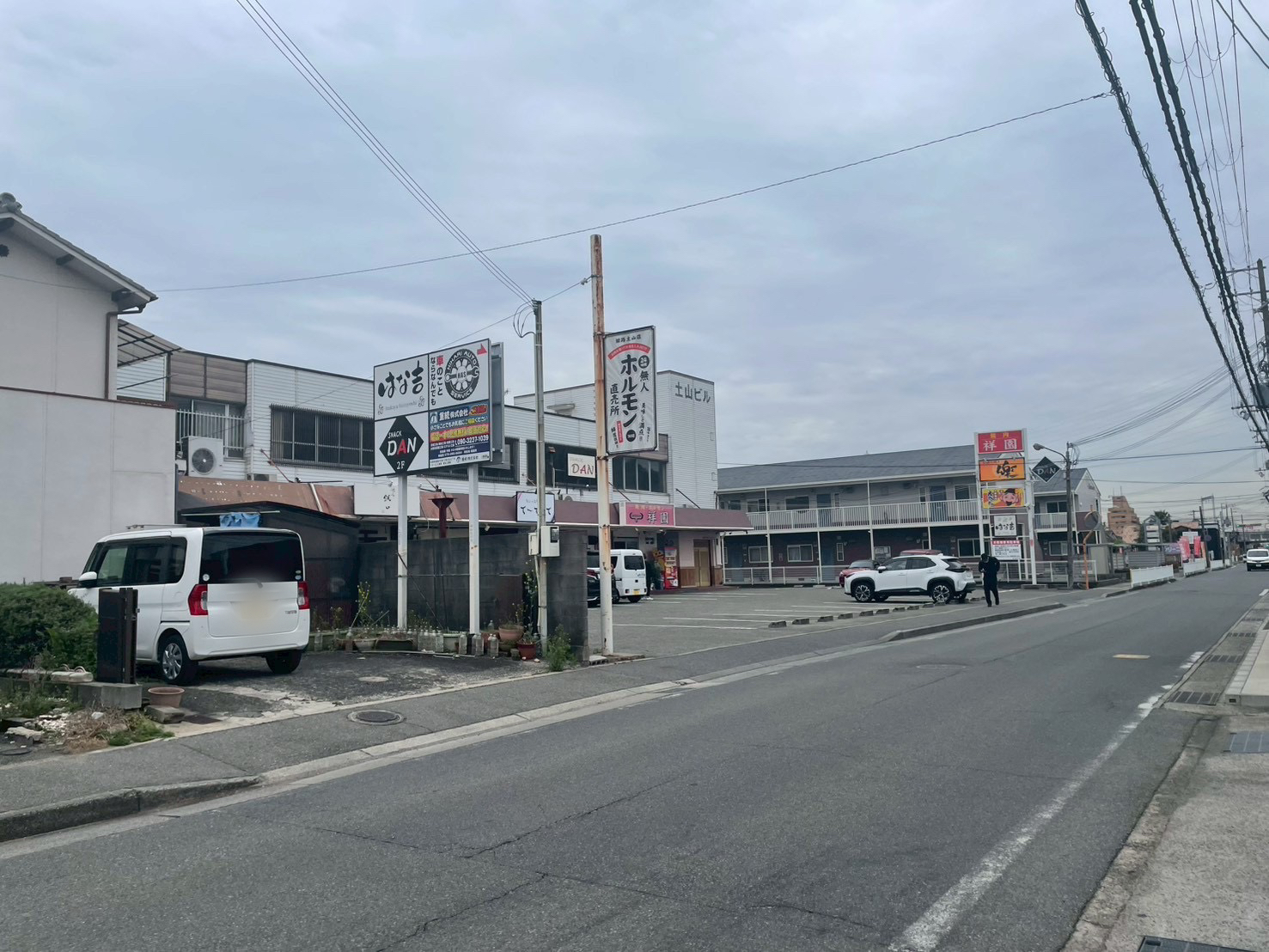 ヒカリオートサービス、その向かいは居酒屋ごんちゃくれ土山店や、大衆カレーたかやがあるビーグル土山。踏切や土山八幡神社がある方面。