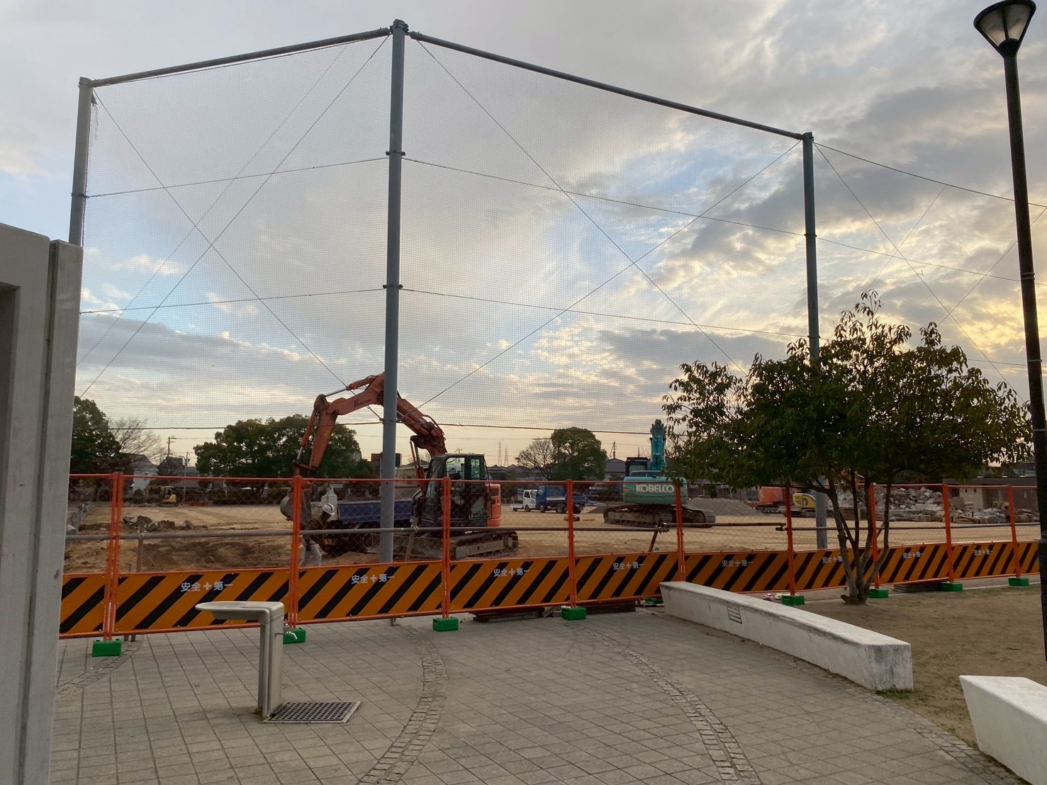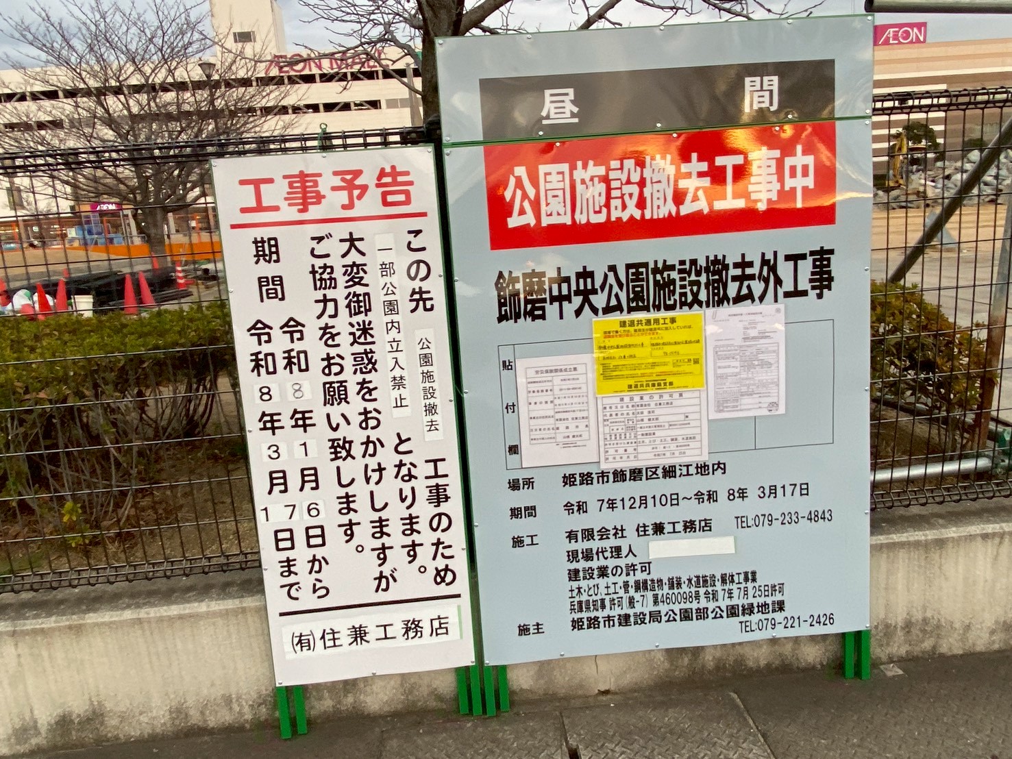 以前記事にも書いた、リニューアル予定の飾磨中央公園の工事が進んでいます。敷地内には重機が入り、遊具等が撤去されていました。撤去工事の期間は2026年3月18日まで予定されています。