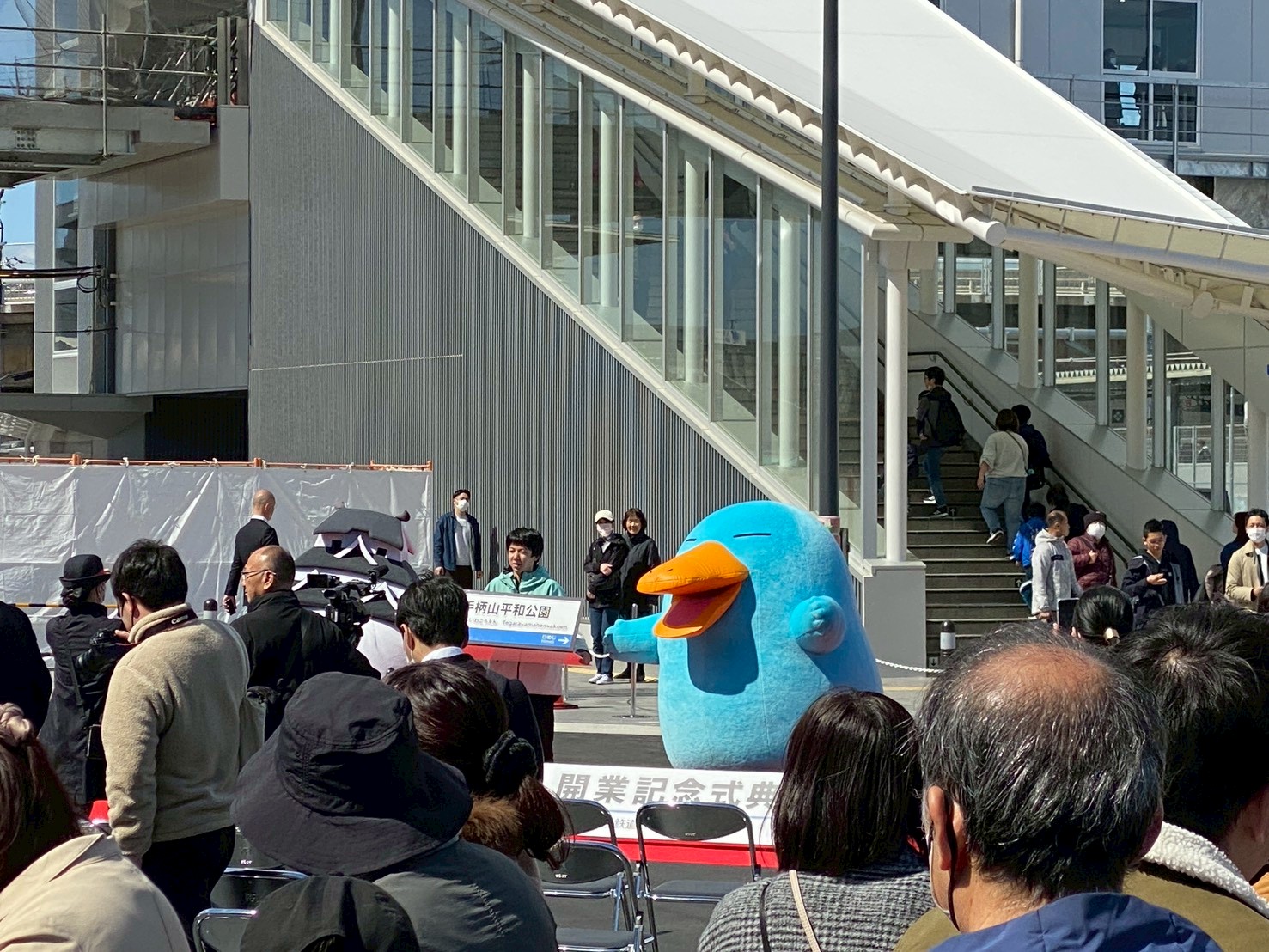 ブドウちゃんによると、JR姫路〜英賀保間に誕生した新駅「手柄山平和公園駅」の開業記念式典は、想像以上の人だったそうです。