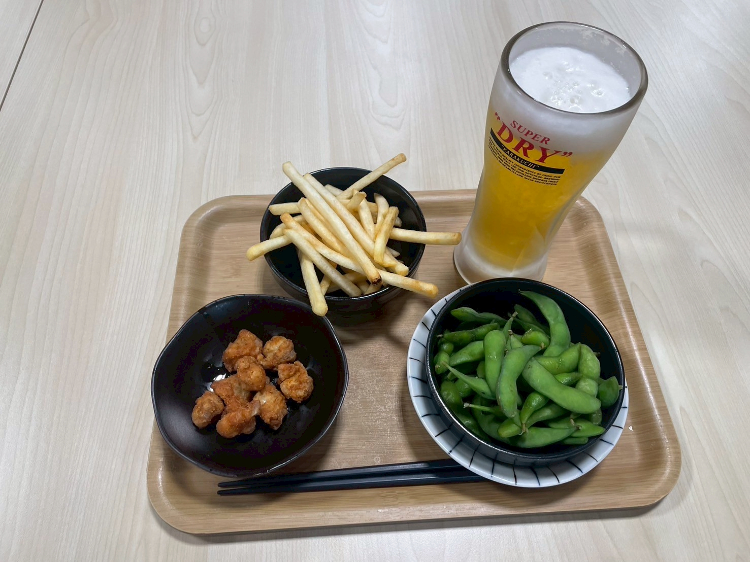 じゃ~ん!ハナカフェおすすめの『選べる晩酌セット』です。生ビール(中)1杯+おつまみ3品で1,054円(税込1,160円)!写真は人気の軟骨のから揚げ、枝豆、フライドポテト。