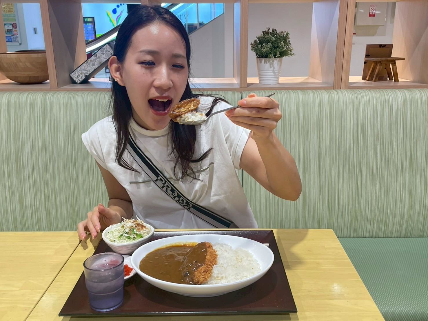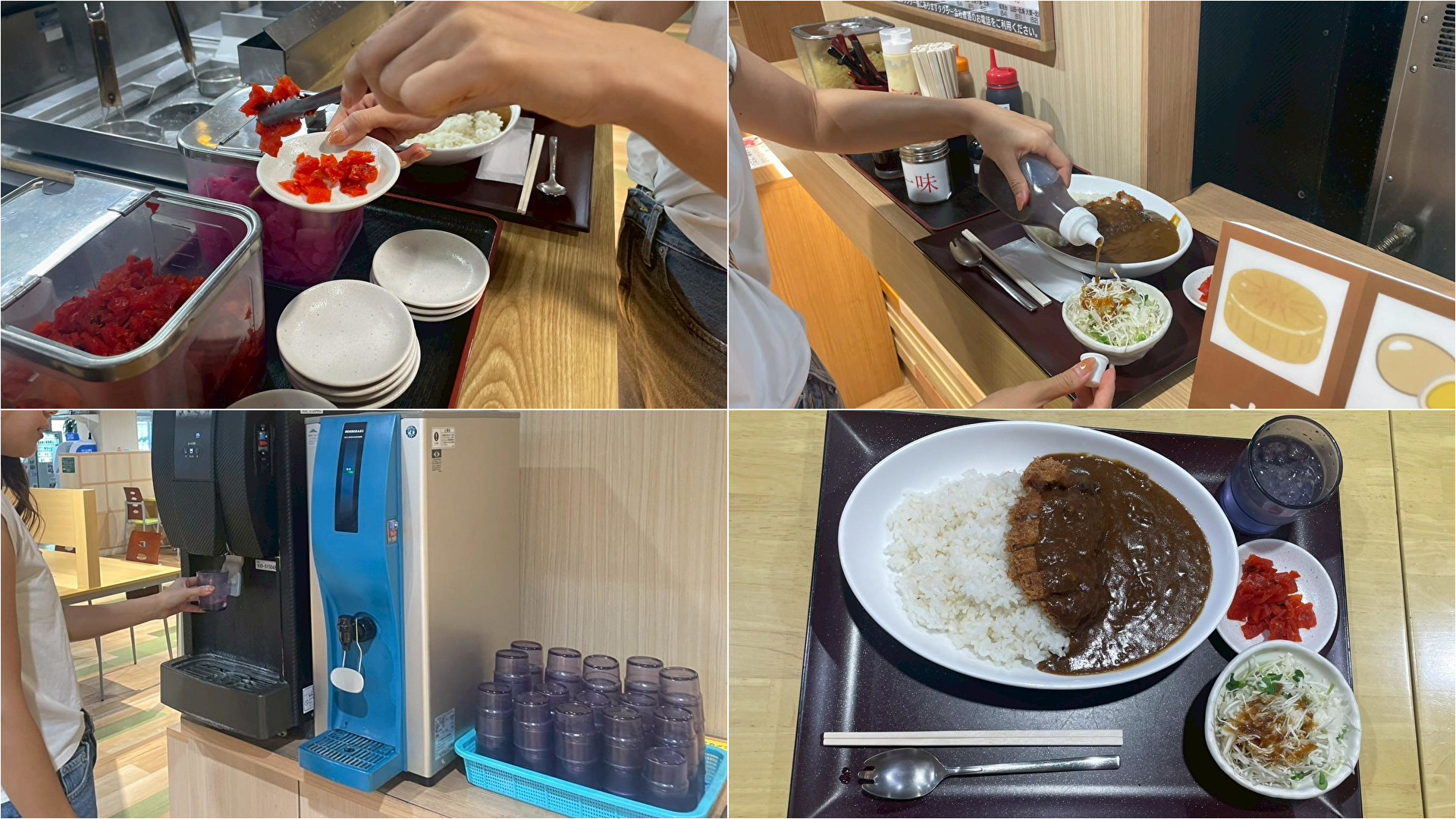 みんな大好きなカツカレーに、ミニサラダ付きです!福神漬けや、ドレッシング、お水をセルフでいれたらお席へ。
