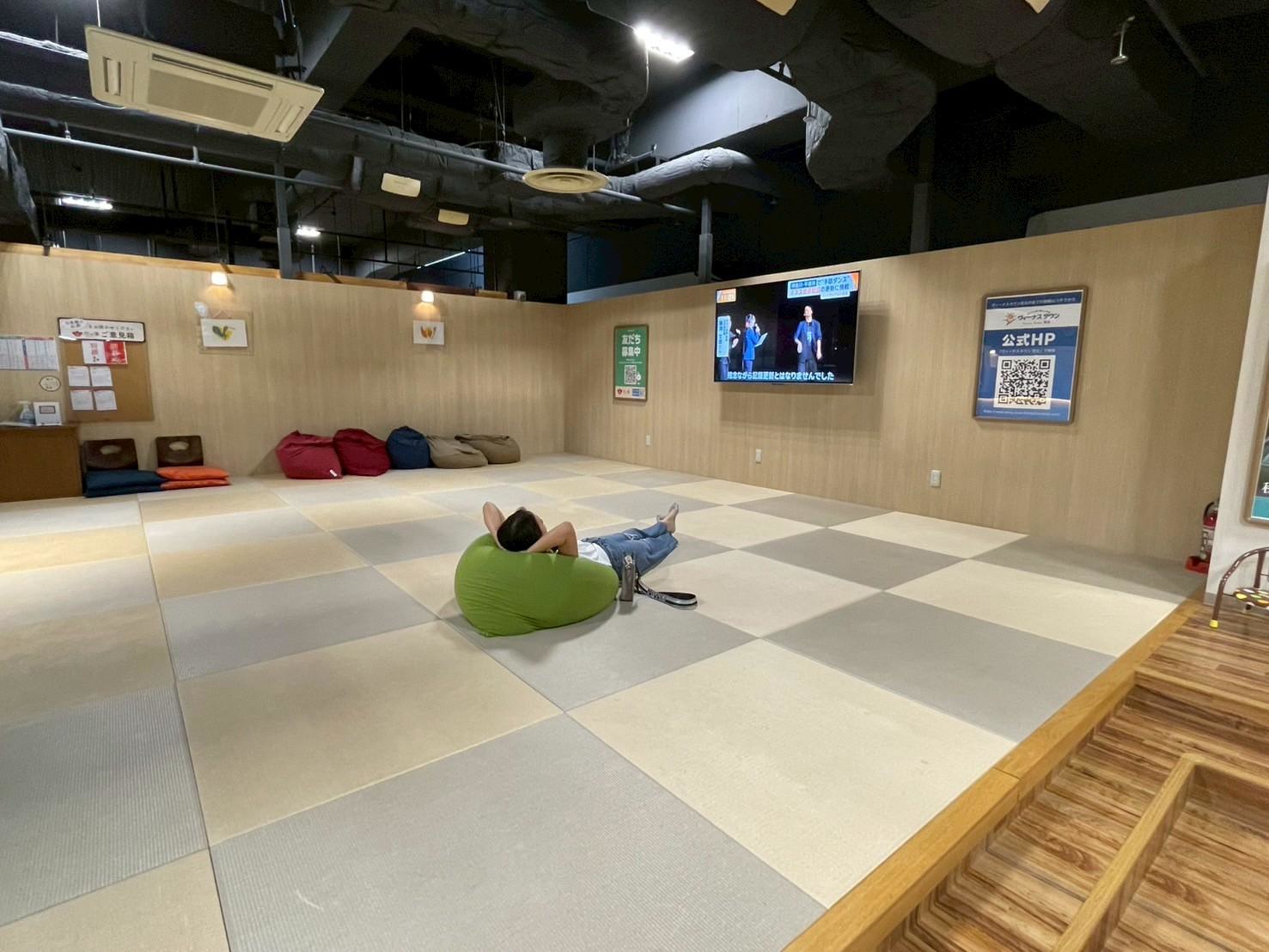 広々とした畳スペース!ヨギボーでくつろぐもよし。湯上りストレッチもよし。テレビを見ながらまったりとできます。