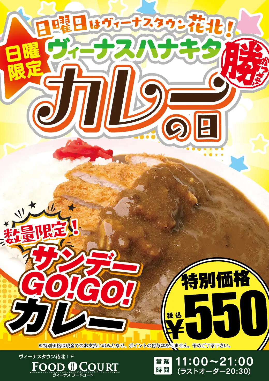 ヴィーナスフードコートでは、日曜限定!数量限定で『サンデー!GO!GO!カレー』が550円の特別価格でいただけます!!これは知っておいてほしい!