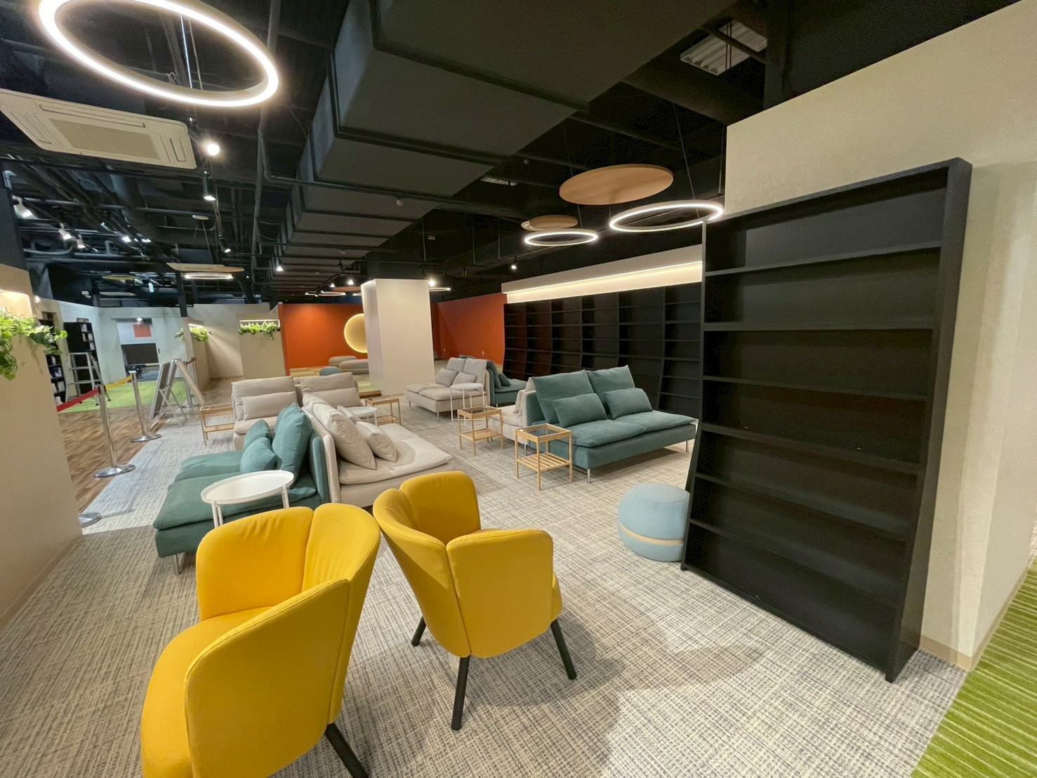くつろぎエリアには約5,000冊の人気漫画が揃った本棚、座り心地の良い椅子やソファー、キッズスペースもこちらにあります。