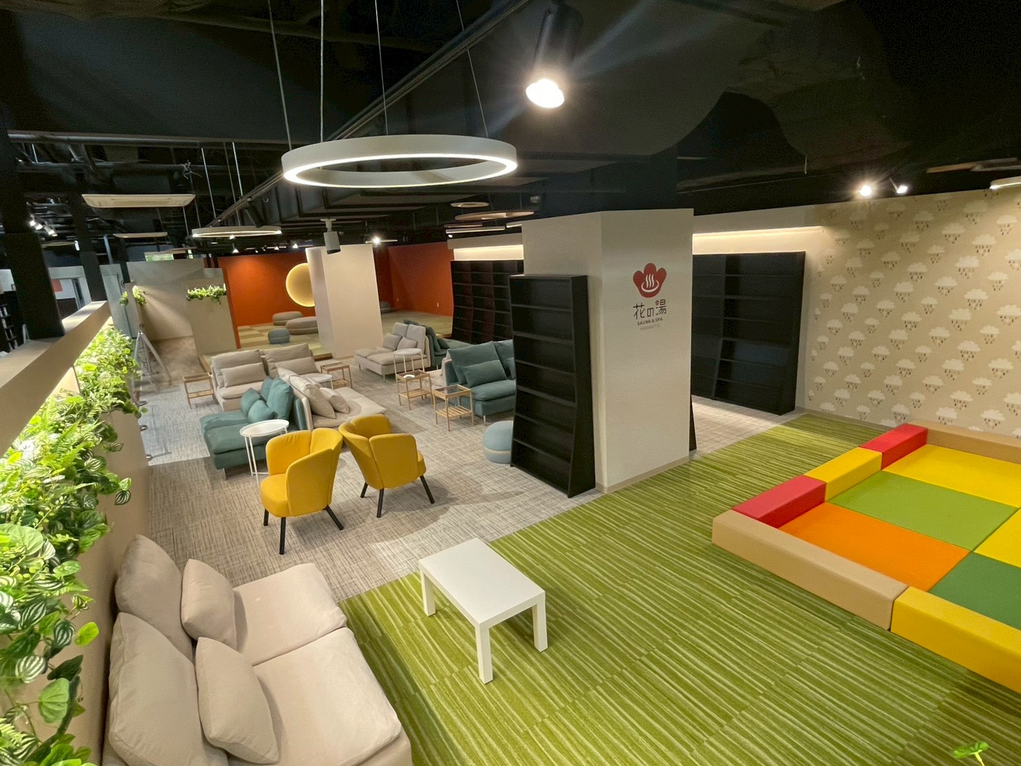 くつろぎエリアには約5,000冊の人気漫画が揃った本棚、座り心地の良い椅子やソファー、キッズスペースもこちらにあります。